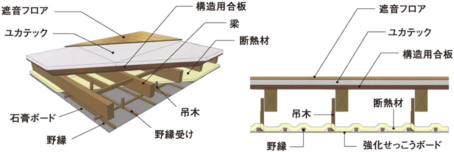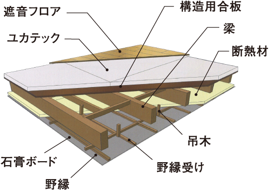 ユカテック工法の床を実際の木造住宅で測定した例では、遮音等級LH-65等級程度の性能が得られました。これは、無対策の床のLH-80等級程度の性能を約15dBも音を低減したことになり、木造建築物の中では優れた遮音効果が得られることを確認しています。ユカテックは軸組工法、ツーバイフォー工法の何れの工法でも、ご採用いただけます。